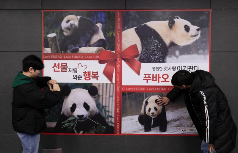 2024年2月16日,在韩国首尔的弘地面铁站,东谈主们与大熊猫“福宝”的海报合影。新华社发(全休相摄)