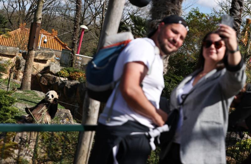 2024年3月22日,在法国圣艾尼昂的博瓦勒野机动物园,旅客与大熊猫“欢欢”自拍眷恋。新华社记者 高静 摄