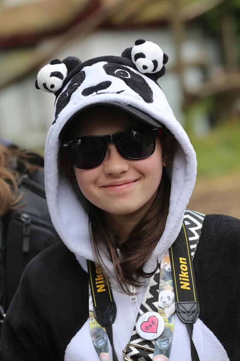 2024年6月2日,在比利时布吕热莱特的天国动物园,别称身穿大熊猫主题衣饰的大熊猫爱好者进入“天宝”的八岁生辰庆祝步履。新华社记者 赵丁喆摄