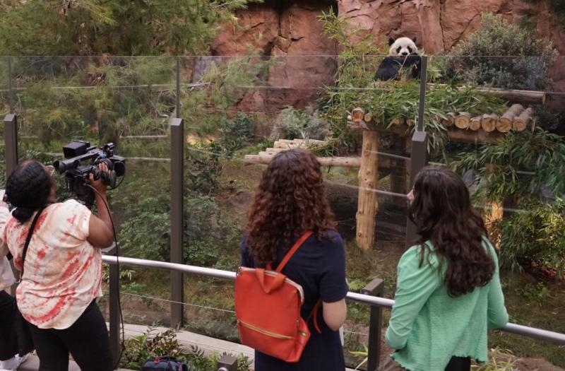 2024年8月8日,媒体记者在好意思国加利福尼亚州圣迭戈动物园“熊猫岭”拍摄大熊猫“云川”。好意思国加州圣迭戈动物园当日为旅好意思大熊猫“云川”和“鑫宝”在新家“熊猫岭”的首秀举行广袤开馆仪式,并将8月8日定为“加州熊猫日”。新华社发(曾慧摄)