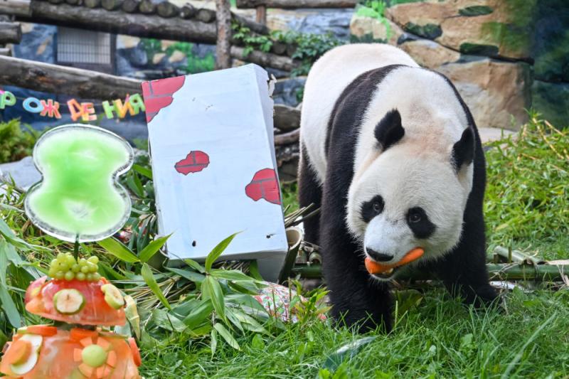 2024年7月31日,俄罗斯莫斯科动物园为大熊猫“如意”庆祝8岁生辰。新华社记者 曹阳 摄