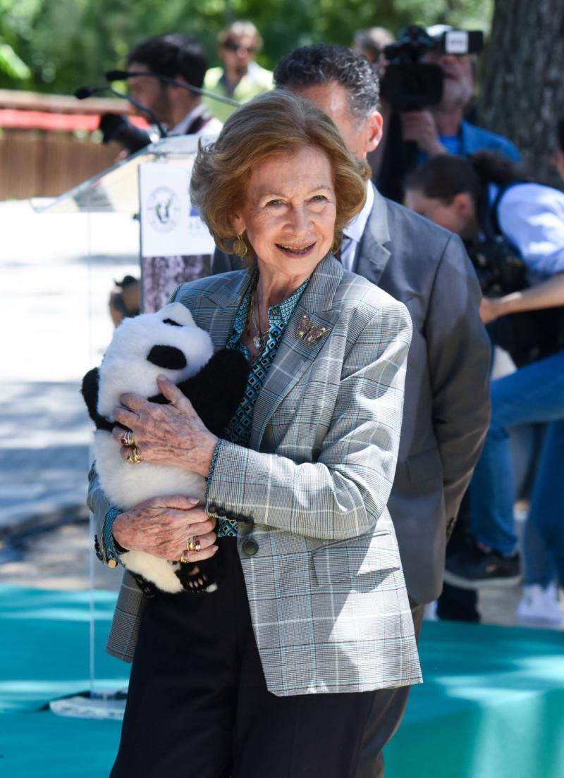 2024年5月30日,西班牙王太后索菲娅怀抱大熊猫玩偶进入在马德里动物园举行的大熊猫公众碰面会。新华社发(古斯塔沃·巴连特摄)