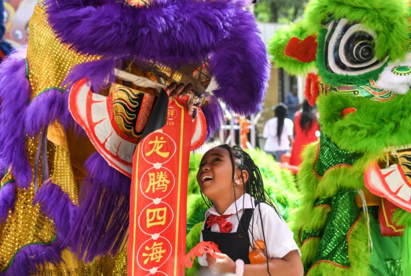 2月7日,小一又友在肯尼亚内罗毕大学孔子学院举行的“龙腾饱读跃闹新春”活动上与舞狮饰演队互动。