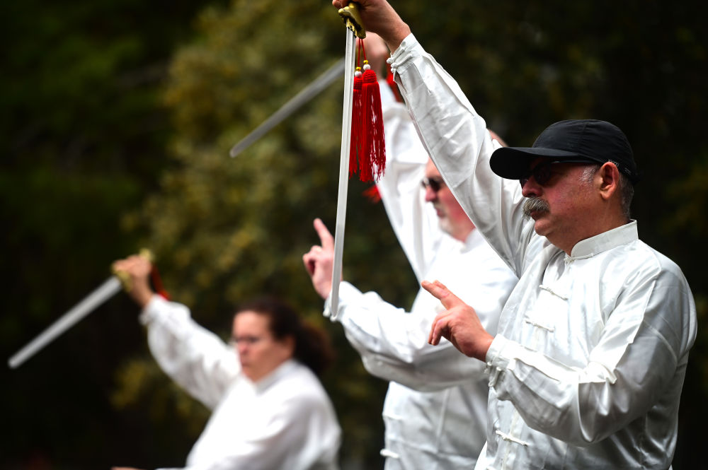 4月27日,在马耳他桑塔露琪亚市举办的“全国太极日”暨“春季庙会”活动上,当地太极爱好者饰演太极剑。