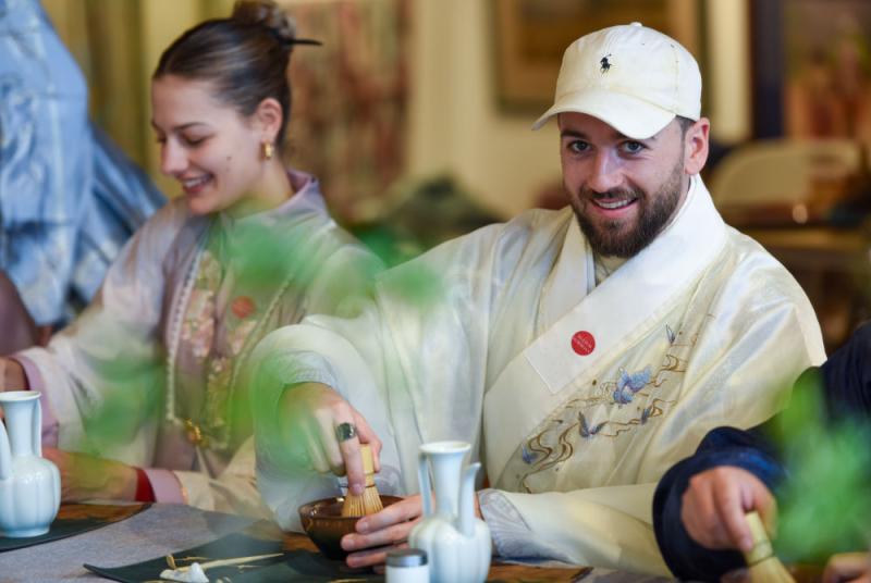 5月18日,新西兰奥克兰的全球在“茶和寰宇·雅会”活动上体验中国宋代点茶。